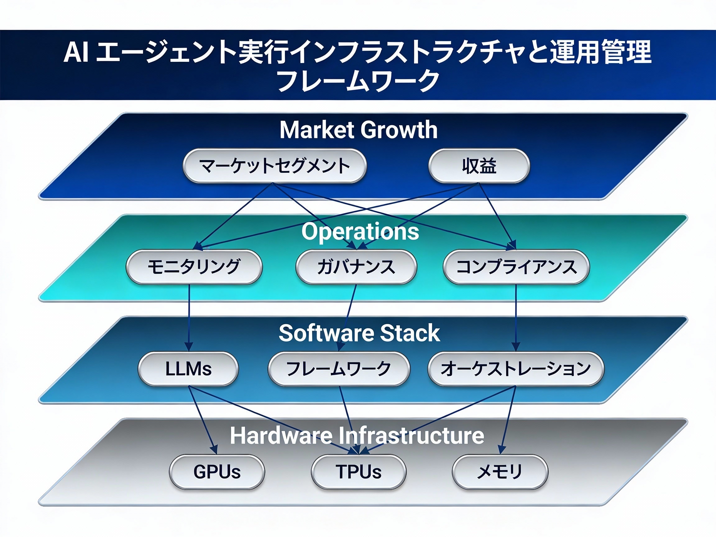 - ハードウェア(GPU/HBM)から推論最適化、AIエージェントのオーケストレーション、ガバナンス・セキュリティまで、200以上のテーマを体系的に展開。2024~2026年の市場規模、成長要因、機会、制約を定量化。