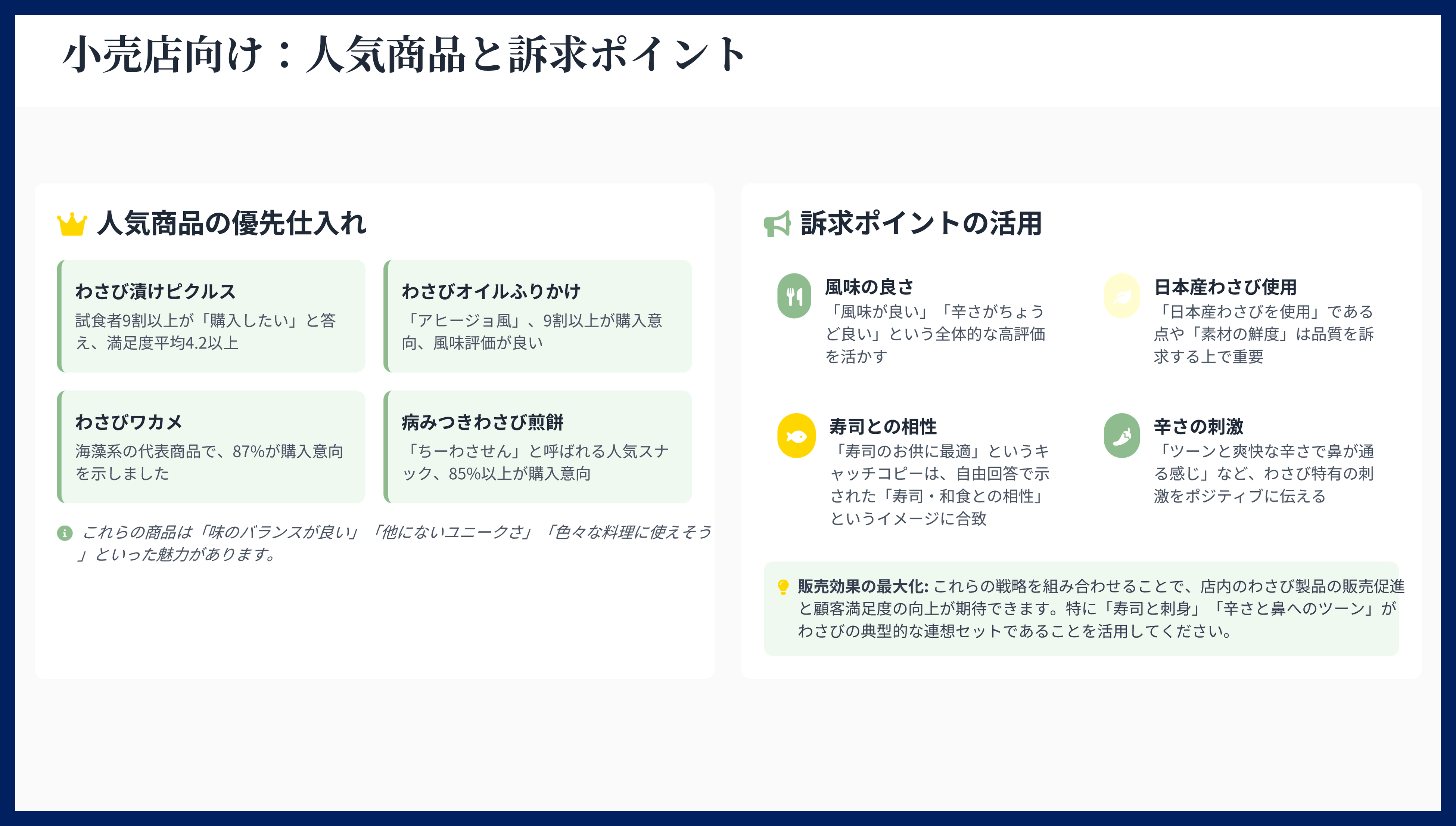熱量」と「スコアリングデータ」を武器に、現地の有力な卸売企業やバイヤーへの商談を実施します。単なる商品提案ではなく、「現地でこれだけの評価と価格受容性がある」という事実ベースの提案を