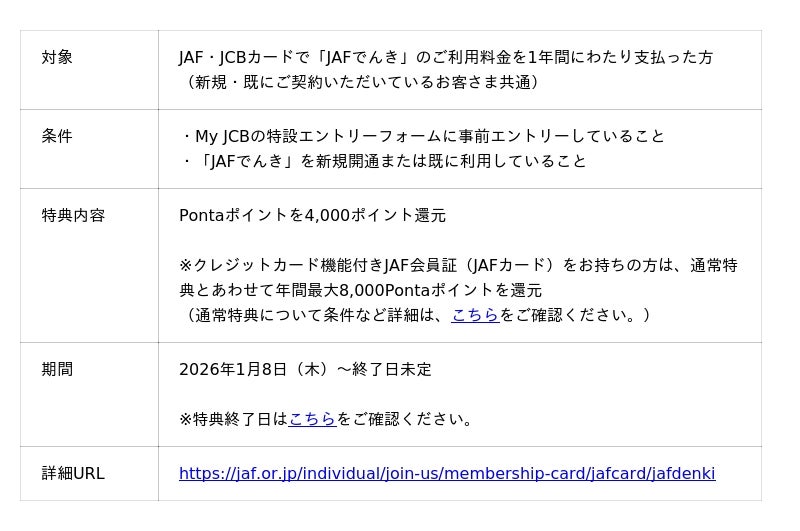 auエネルギー&ライフ株式会社(本社:東京都千代田区、代表取締役社長:齋藤 茂、以下:auエネルギー&ライフ)は、一般社団法人日本自動車連盟(本社:東京都港区、会長:坂口 正芳、以下:JAF)および株式会社ジェーシービー (本社:東京都港区、代表取締役会長兼執行役員社長:二重 孝好、以下:JCB)と連携し、JAF・JCBカードを利用するお客さまを対象に、家庭向け電気サービス「JAFでんき」のご利用料金を1年間継続して支払うごとに毎年4,000Pontaポイントをプレゼントする特典を開始します。