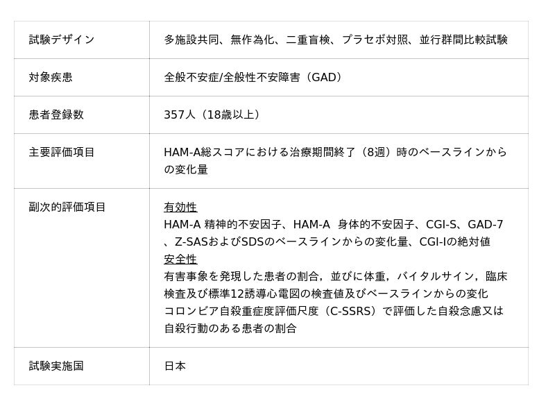 - 本試験では、18歳以上の日本人GAD患者357名を、ベンラファキシン群とプラセボ群に1:1の割合で無作為に割り付け(ベンラファキシン群:179名、プラセボ群:178名)、投与開始8週間後のベンラファキシンの有効性と安全性をプラセボと比較しました。- 主要評価項目は、投与開始8週間後のハミルトン不安評価尺度(HAM-A)の総スコアの変化量とし、ベンラファキシン群-11.5に対し、プラセボ群-9.6であり、統計学的に有意な差が認められました(p値=0.012)。- 以下の副次的評価項目においても、プラセボ群と比較して、ベンラファキシン群で有意な改善が認められました。- - 下記スコアにおける投与開始8週間後のベースラインからの変化量- - - HAM-A精神的不安因子(項目1~6及び14)- - - HAM-A身体的不安因子(項目7~13)- - - 臨床全般印象・重症度(CGI-S)- - - 全般性不安障害尺度7項目(GAD-7)- - - Zung不安自己評価尺度(Z-SAS)- - - Sheehan機能障害評価尺度(SDS)- - 臨床全般印象・全般改善度(CGI-I)の絶対値- 参加者のうち197名(全体の55.2%;ベンラファキシン群:113名[63.1%]、プラセボ群:84名[47.2%])が治療下で発現した有害事象(TEAE)を少なくとも1回経験し、そのほとんどが軽度もしくは中等度でした。重篤なTEAEはプラセボ群で2名(1.1%)に認められました(自殺既遂、気胸)。頻度の高かったTEAEは、傾眠(11.2%、ベンラファキシン群:14.5%、プラセボ群:7.9%)、上咽頭炎(7.6%、ベンラファキシン群:7.3%、プラセボ群:7.9%)、悪心(7.0%、ベンラファキシン群:11.2%、プラセボ群:2.8%)、便秘(6.4%、ベンラファキシン群:7.8%、プラセボ群:5.1%)、頭痛(5.9%、ベンラファキシン群:5.0%、プラセボ群:6.9%)でした。