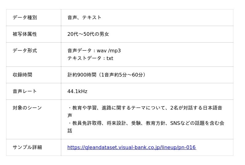 Visual Bank株式会社(東京都港区、代表取締役CEO 永井真之)は、傘下の株式会社アマナイメージズを通じて展開するAI学習用データソリューション「Qlean Dataset(キュリンデータセット)」において、ASR(自動音声認識)、NLP(自然言語処理)、LLMなどの音声・言語系AI開発に向けた「日本語・2話者・教育テーマトーク音声コーパスとトランスクリプト」の提供を開始しました。