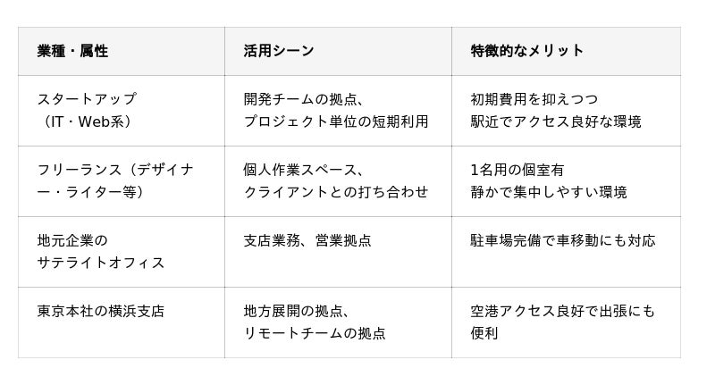 「オープンオフィス港北ニュータウン」は、コストパフォーマンスに優れた無人型オフィスとして、以下のような多様な業種・働き方に対応可能です。