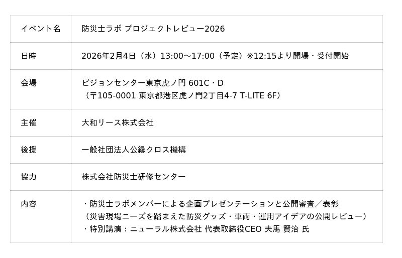 大和ハウスグループの大和リース株式会社(本社:大阪市中央区、社長:北 哲弥)は、防災士有資格者による社内プロジェクト「防災士ラボ」の最終成果発表会として、「防災士ラボ プロジェクトレビュー2026」を、2026年2月4日(水)に東京・虎ノ門にて開催いたします。