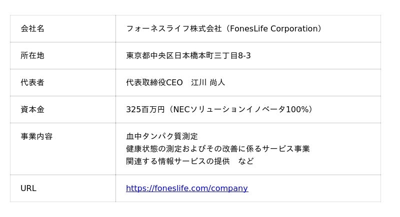 フォーネスライフは、NECグループのヘルスケア事業を担うNECソリューションイノベータが100%出資する会社です。米国Standard BioTools(TM)社の血中タンパク質測定技術と、NECグループのビッグデータ解析・先端ICTを用い、認知症などの将来の疾病リスク予測に基づく、一人ひとりに適した生活習慣の改善提案を行うことで、“誰も病気にならない未来”、“誰もが自分らしく生きられる社会”の実現を目指しています。