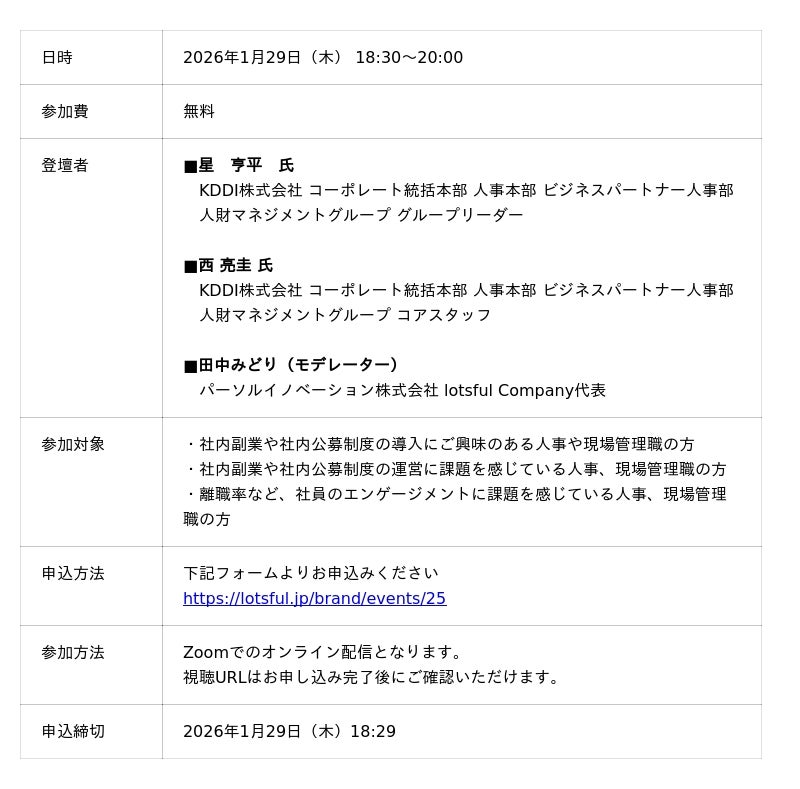 https://lotsful.jp/ )は、2026年1月29日(木)に「社内副業の取り組みの裏側に迫る!vol.3 KDDIが実践する『三方よし』の社内副業制度とは?」をテーマにオンラインセミナーを開催いたします。