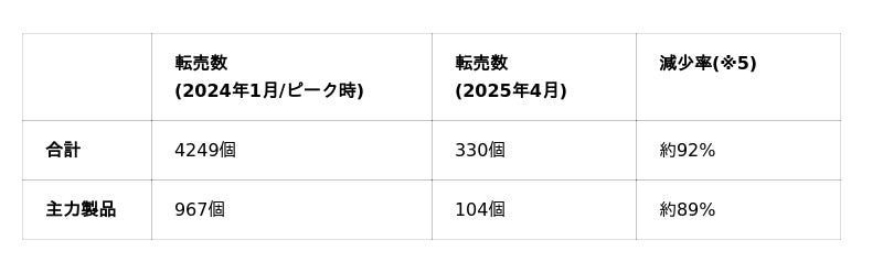 データによると、サービス導入と並行した対策により、2025年1月を境に主要製品の転売数が大幅に減少。