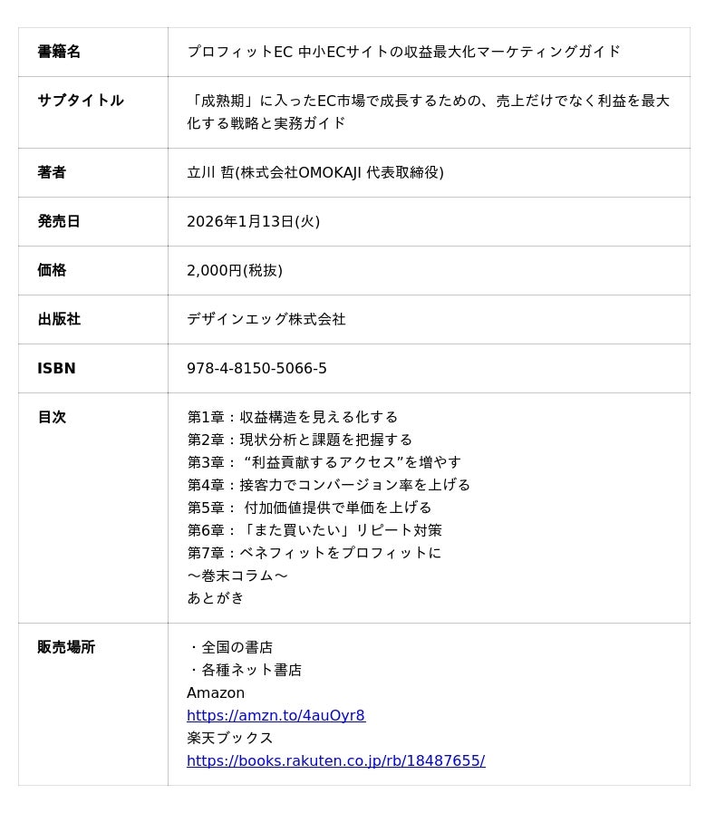 2026年1月13日、株式会社OMOKAJI(所在地:東京都中野区、代表取締役:立川哲)は、中小EC事業者・マーケティング担当者向け書籍『プロフィットEC 中小ECサイトの収益最大化マーケティングガイド』(デザインエッグ)を発売いたします。