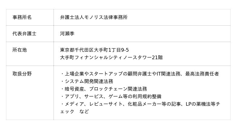 モノリス法律事務所は、IT・インターネット・ビジネス分野に強みをもつ法律事務所です。元ITエンジニアの弁護士が代表を務め、IT企業の顧問業務、システム開発紛争、誹謗中傷対策、Webサービスの適法性リサーチなど、高度な専門知識を要するリーガルサービスを提供しています。常にビジネスの現場に寄り添い、法を武器にクライアントの課題解決と成長を支援いたします。