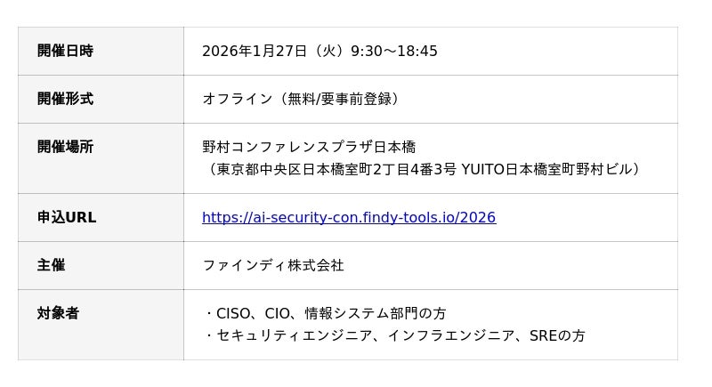 エンジニアプラットフォームを提供するファインディ株式会社(東京都品川区、代表取締役:山田 裕一朗、以下「当社」)は、2026年1月27日(火)に開催する「AI Security Conference」の参加申し込み者数が500名を突破したことを発表します。