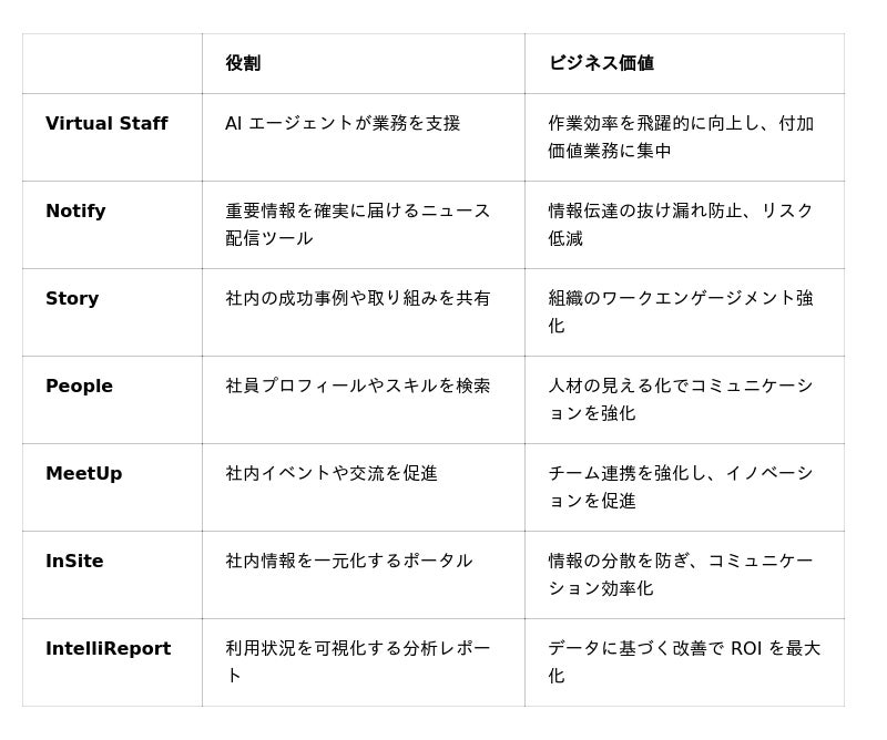 ニュース管理「Notify」、ナレッジ管理「Story」、スキル管理「People」、ポータル管理「InSite」、レポートサービス「IntelliReport」など、アプリケーション単位で展開していたプロダクトを統合し、AI エージェント「Virtual Staff」と掛け合わせることで、お客様の業務改革をこれまで以上に推進してまいります。