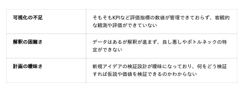 外的要因や市場などの変化が大きいなかで、プロダクト開発は「作って終わり」ではなく、市場やユーザーのフィードバックを得て改善し続ける「アジャイル」で継続的なアプローチが不可欠です。しかし、多くの現場では以下のような課題により、次のアクションへの意思決定が停滞してしまうケースが散見されます。