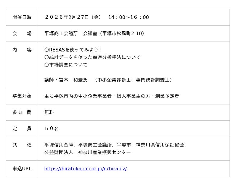 平塚信用金庫、平塚商工会議所、平塚市、神奈川県信用保証協会、公益財団法人 神奈川産業振興センター(5者連携)は『中小企業の経営支援における連携』において、共催セミナーを開催します。環境の変化が著しい昨今、ニーズは多様化し客観的に自社の状況を把握することが難しい時代となりました。本セミナーでは事業の見直しや市場調査に統計データを使って実施する方法を詳しく解説いたします。補助金の申請時にも活用できる内容になりますので、この機会に是非ご参加ください。