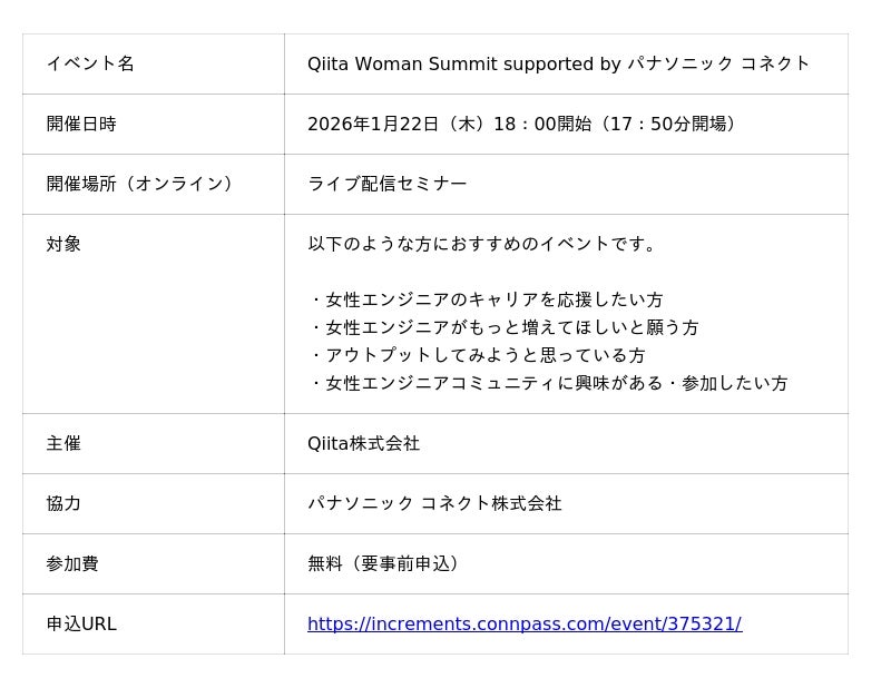 創造性と技術力で多様なITサービスを展開する株式会社エイチームホールディングスのグループ会社で、エンジニアに関する知識を記録・共有するためのサービス「Qiita(キータ)」を展開しているQiita株式会社(本社:名古屋市中村区、代表取締役社長:柴田健介)は、パナソニック コネクト株式会社(本社:東京都中央区、代表取締役 執行役員 プレジデント・CEO:樋口 泰行)による協力のもと、2026年1月22日(木)に「Qiita Woman Summit」をオンラインで開催します。