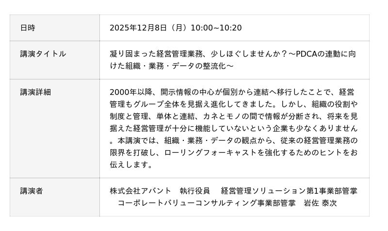 アバント、「変化に強い経営管理を実現する“ローリングフォーキャスト”」にて「PDCA連動を進める組織・業務・データ整流化」をテーマに講演