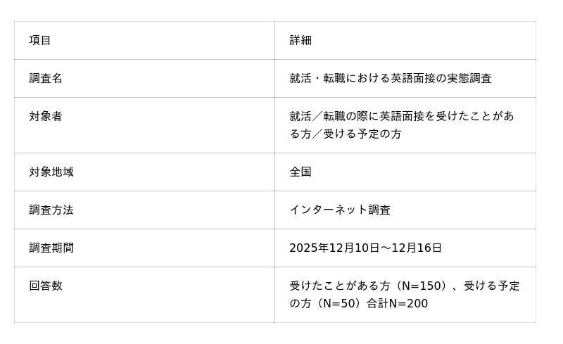 そこで、本調査「就活・転職における英語面接の実態調査」では、英語面接経験者及び受験予定者200名を対象に調査を行い、英語面接の不安や失敗の実態、効果的な対策を調べた。