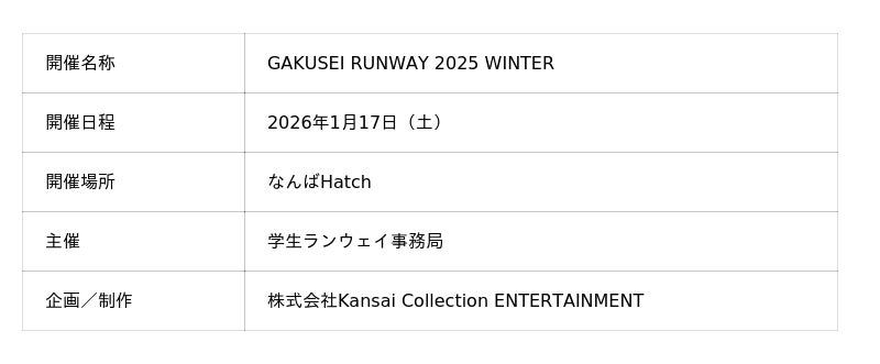 100円ショップや雑貨店など全国1,900店舗以上を運営する株式会社ワッツ(本社:大阪府大阪市中央区、代表取締役:平岡史生)は、2026年1月17日(土)に大阪・なんばHatchで開催される「GAKUSEI RUNWAY 2025 WINTER」に協賛いたします。当日は、2025年5月に実施された「GAKUSEI RUNWAY 2025 SUMMER」で選出されたワッツ学生委員会 1期生が、特別ステージ出演・トークショー等を展開します。