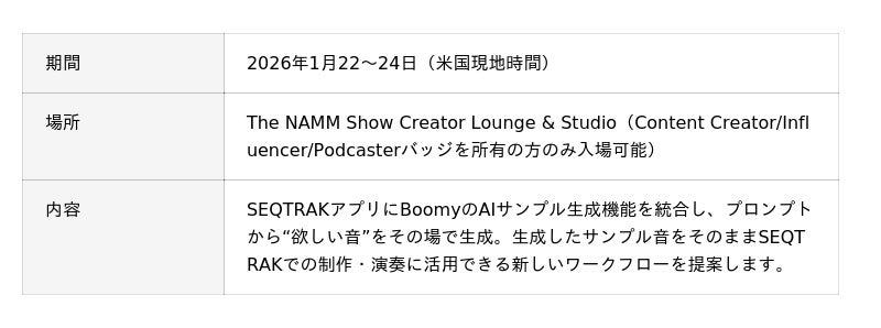 技術検証の第一歩として、2026年1月に米国・カリフォルニア州で開催されるThe NAMM Showにて、クリエイター向けの体験会を実施します。「SEQTRAK」は、ドラムやシンセなどさまざまなサウンドを組み合わせ、直感的な音楽制作を可能にするオールインワンギアです。内蔵音源に加え、専用アプリに生成AIを組み込むことで、音素材を簡単に追加でき、クリエイターのインスピレーションを拡張する新しい音楽制作体験を提案します。