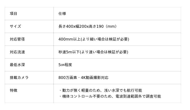 近年、大口径な管路においてはマルチコプター型のドローンによる点検等、新技術の導入が進められていますが、小口径な管路ではドローンが飛行できないためカメラ車を用いた点検が主流となっており、作業員がマンホールに入っての作業が必要になる上、流速が速い区間や水中に異物が混入している区間では点検できない場合もありました。