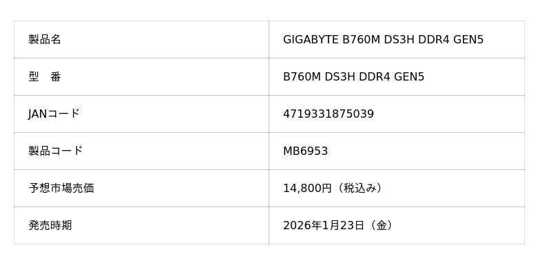 株式会社ニューエックス(本社:東京都千代田区)は、取り扱いメーカーであるGIGABYTEより、intel B760 チップセットを搭載した Amazon モデル Micro-ATX マザーボードの「GIGABYTE B760M DS3H DDR4 GEN5」を2026年1月23日(金)に発売いたします。