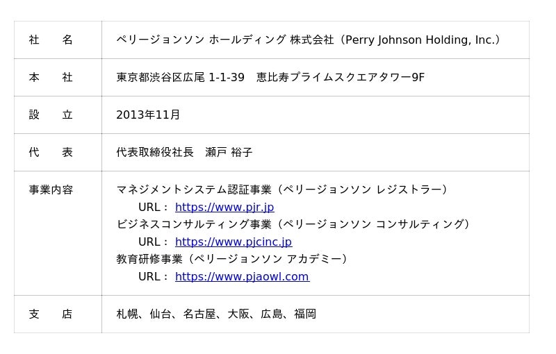 1994 年に設立されたマネジメントシステムの第三者認証機関 Perry Johnson Registrars, Inc.(本社:米国ミシガン州)の日本法人として、ISO 9001(品質)、ISO 14001(環境)、ISO/IEC 27001(情報セキュリティ)、 ISO 22000(食品安全)、FSSC 22000(食品安全)、ISO 45001(労働安全衛生)など、さまざまな規格の認証審査を行っています。2013 年 11 月にペリージョンソン ホールディング株式会社を発足しました。