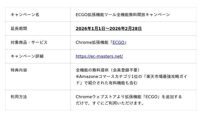 Chrome拡張機能「ECGO」全機能無料開放キャンペーン、大好評につき2026年2月28日まで延長決定!