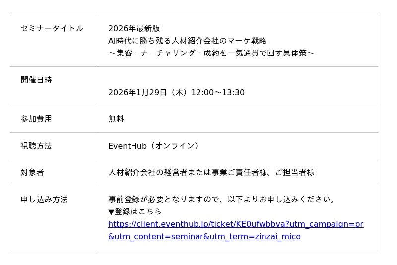 LINEやAIコールを活用し顧客コミュニケーションのプラットフォームを提供する株式会社Mico(本社:大阪市北区、代表取締役社長:山田 修)は、REHATCH株式会社、株式会社HERP、ポーターズ株式会社の3社と共同で「2026年最新版 AI時代に勝ち残る人材紹介会社のマーケ戦略 ~集客・ナーチャリング・成約を一気通貫で回す具体策~」と題した無料セミナーを2026年1月29日(木)12:00~オンラインにて開催いたします。