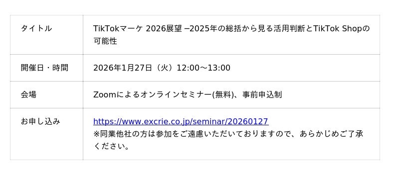 株式会社クロス・マーケティンググループのグループ会社であるソーシャル&セールスプロモーションサービスを展開する株式会社エクスクリエ(本社:東京都新宿区、代表取締役社長:小笠原 亨、以下「エクスクリエ」)は、2026年1月27日(火)に、SNSマーケティングの次なる一手を見極めるためのオンラインセミナー「TikTokマーケ 2026展望 ─2025年の総括から見る活用判断とTikTok Shopの可能性」を開催いたします。