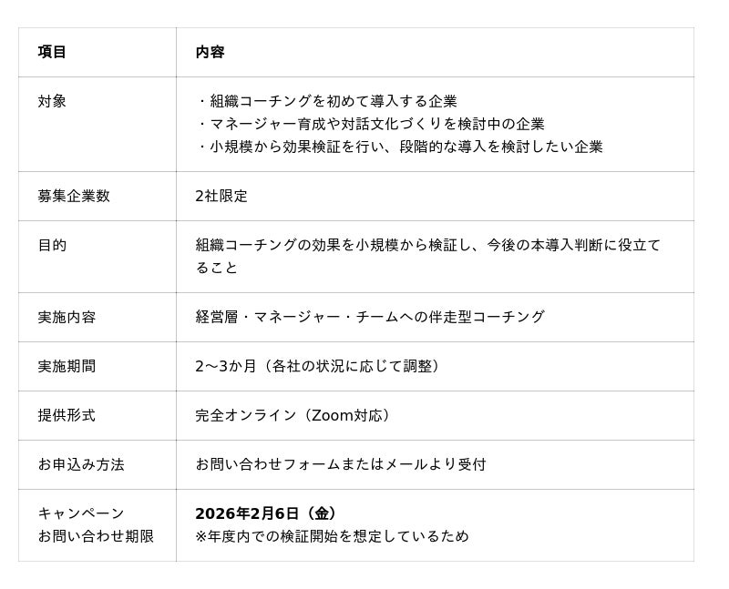 外部プロコーチが第三者として伴走し、対話施策の実装と関係性改善を小規模から検証できる、期間・社数限定の導入支援施策