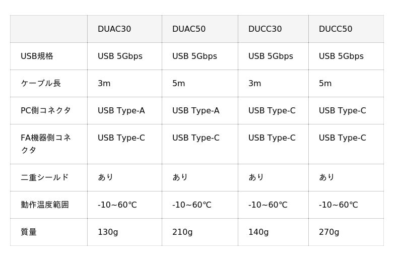 FA機器ハーネス・産業用ネットワーク製品を提供するダイヤトレンド株式会社(本社:大阪府大阪市、代表取締役 宮下清哉、以下ダイヤトレンド)は、表示器GOT3000シリーズ等、最新の三菱電機製FA機器とパソコンを接続する用途に最適化した産業用USBケーブル4種を2026年2月27日に発売いたします。接続コネクタ(Type-A/Type-C)と長さ(3m/5m)のバリエーションを用意し、USB Type-AとType-Cを接続する「DUAC30」「DUAC50」と、USB Type-C to Type-Cを接続する「DUCC30」「DUCC50」を展開。動作確認済みのため、産業用現場でも安心してご使用いただけます。