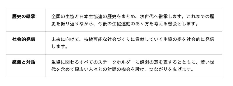 日本生協連は今年、「歴史の継承」「社会的発信」「感謝と対話」の3つをテーマに、特設サイトでの発信や記念書籍の発行など、年間を通して創立75周年記念事業を実施します。