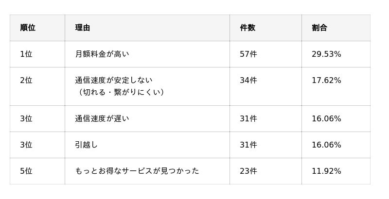 下記の表では、本調査で回答数が多かった乗り換え・解約理由上位5項目を掲載しています。
