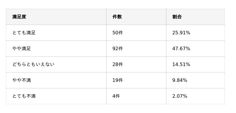 本調査の結果では、とても満足という回答と、やや満足という回答を合わせると約73%の回答者が満足しています。やや不満、とても不満という回答を合計しても約11%のため、回答者の多くが満足していることが伺えます。