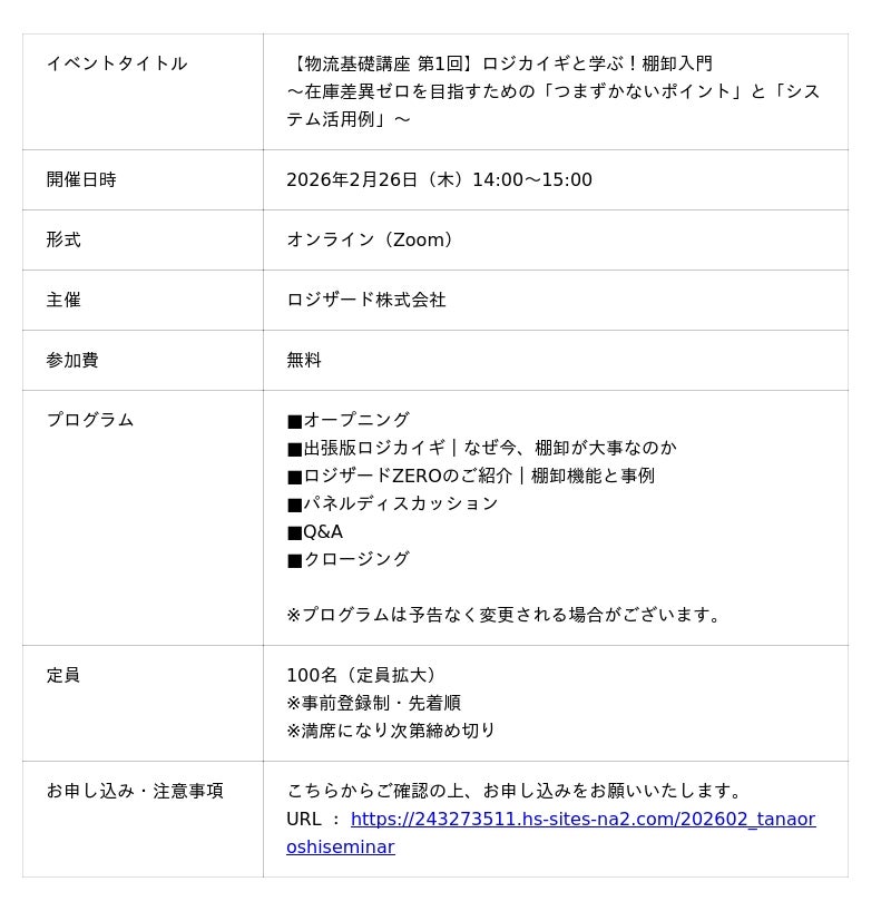 クラウド型在庫管理システムのリーディングカンパニーであるロジザード株式会社(東京都中央区、代表取締役社長:金澤 茂則、以下:ロジザード)は、2026年2月26日(木)14:00~15:00開催のオンラインセミナー『【物流基礎講座 第1回】ロジカイギと学ぶ!棚卸入門~在庫差異ゼロを目指すための「つまずかないポイント」と「システム活用例」~』について、事前申し込みが想定を上回っていることを受け、定員を50名から100名へ拡大することを決定しましたのでお知らせいたします。