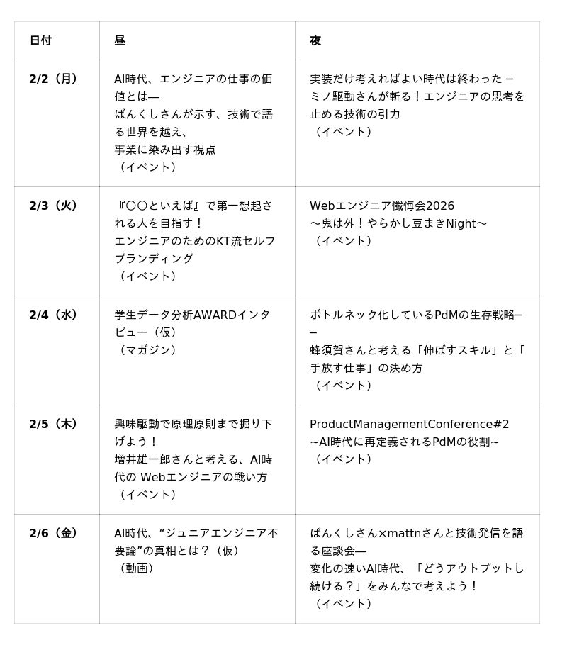 「はたらいて、笑おう。」をビジョンに掲げるパーソルグループのパーソルイノベーション株式会社 TECH PLAY Company(本社:東京都港区、TECH PLAY Company代表:片岡 秀夫)が運営する、30万人※の会員をもつテクノロジー人材のエンパワーメントと企業のDX組織構築の支援サービスを提供する『TECH PLAY(テック プレイ)』は(、次世代のリーダーエンジニアに今必要なコンテンツを届ける新企画「みんなのTECH PLAYまつり」を2026年2月2日(月)から2月6日(金)の5日間にわたって開催いたします。本イベントでは、オンラインイベントや動画、マガジンなどのコンテンツを通じて、変化の速いAI時代においてエンジニアが何を学び、どう進むのかを見つめ直し、次の一歩を考えるヒントを提供します。