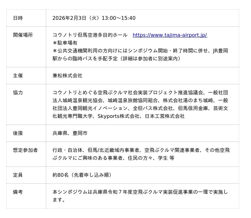兼松株式会社は、2026年2月3日(火)にシンポジウム“北近畿における空飛ぶクルマ実現に向けて~コウノトリとめぐる空飛ぶクルマ社会実装プロジェクトについて語ろう~”を開催いたします。詳細資料と参加申し込みは以下になりますので、ご関心をお持ちの皆さまにおかれましては、ぜひ、ご参加賜りますようお願い申し上げます。