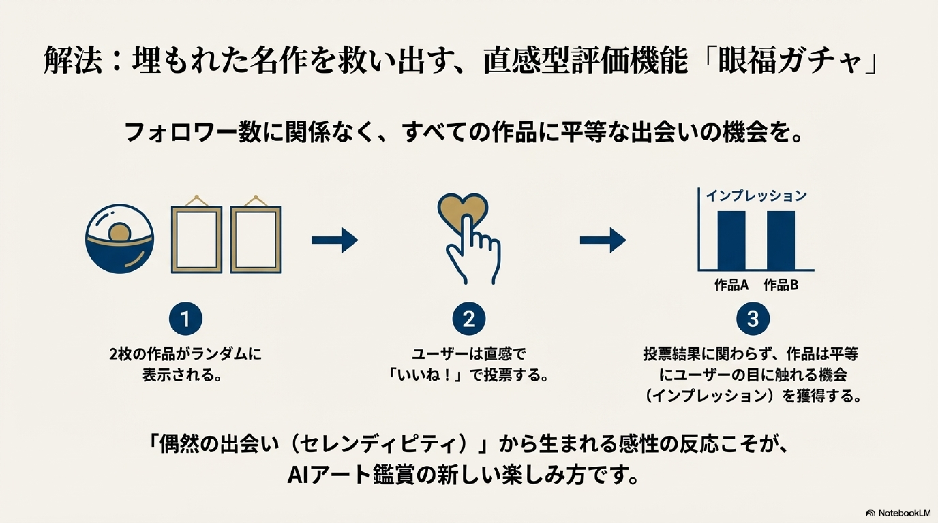 AIアートにおいて、クリエイターのモチベーションのひとつは「作品が見られ、評価されること」です。しかし、投稿数が増えるほど、良い作品であっても埋もれてしまうという課題があります。「投稿しても誰にも見てもらえない」というクリエイターの悩みを解決するのが、独自機能「眼福ガチャ」です。