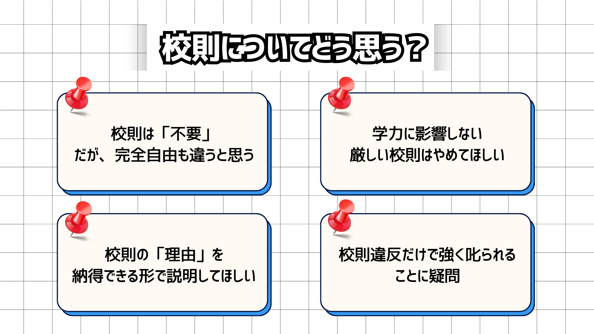 - 「学力に関係ない校則を強いるなら、納得できる理由を説明してほしい」- 「一生に一度の青春なのに、ルール違反だけで強く叱られることに疑問を感じる」