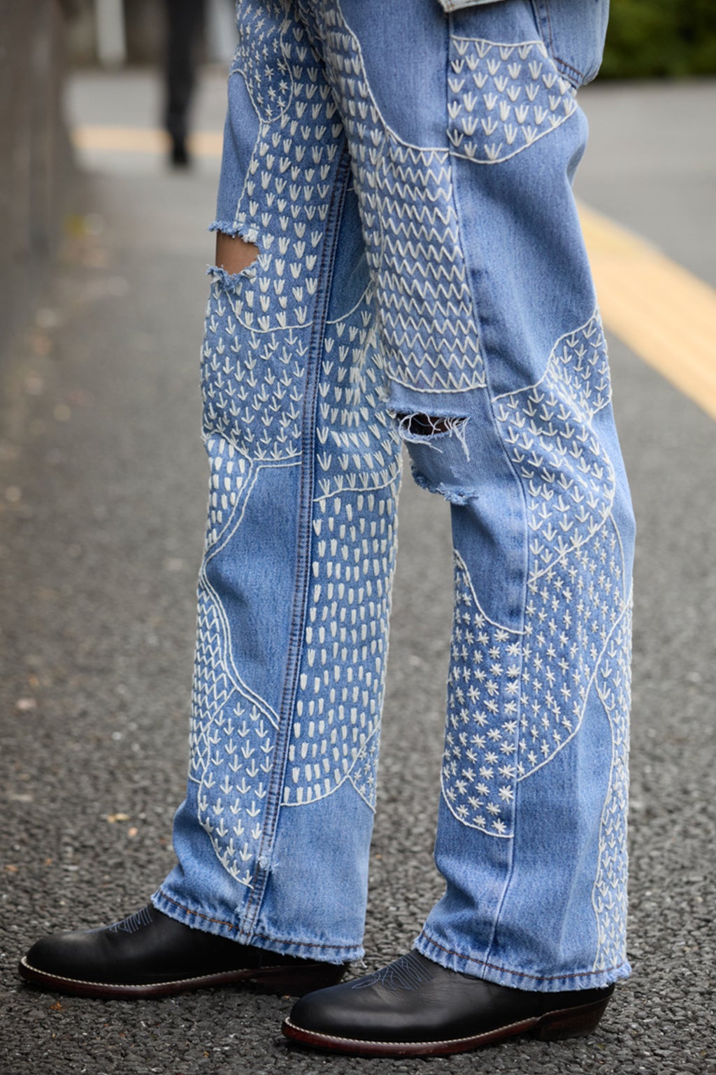 ヒップ周りまで贅沢に施した刺繍は圧巻の存在感です。無地のTシャツを合わせるだけで、スタイルが完成します。