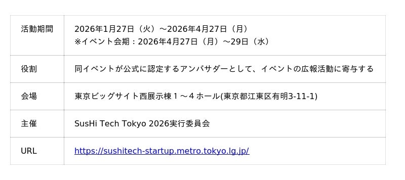 株式会社GENOVA(本社:東京都渋谷区、代表取締役社長:平瀬智樹/以下:GENOVA)は、2026年4月27日(月)~29日(水・祝)に東京で開催される、アジア最大級のグローバルイノベーションカンファレンス「SusHi Tech Tokyo 2026(スシテック トウキョウ 2026)」のアンバサダーに就任したことをお知らせいたします。