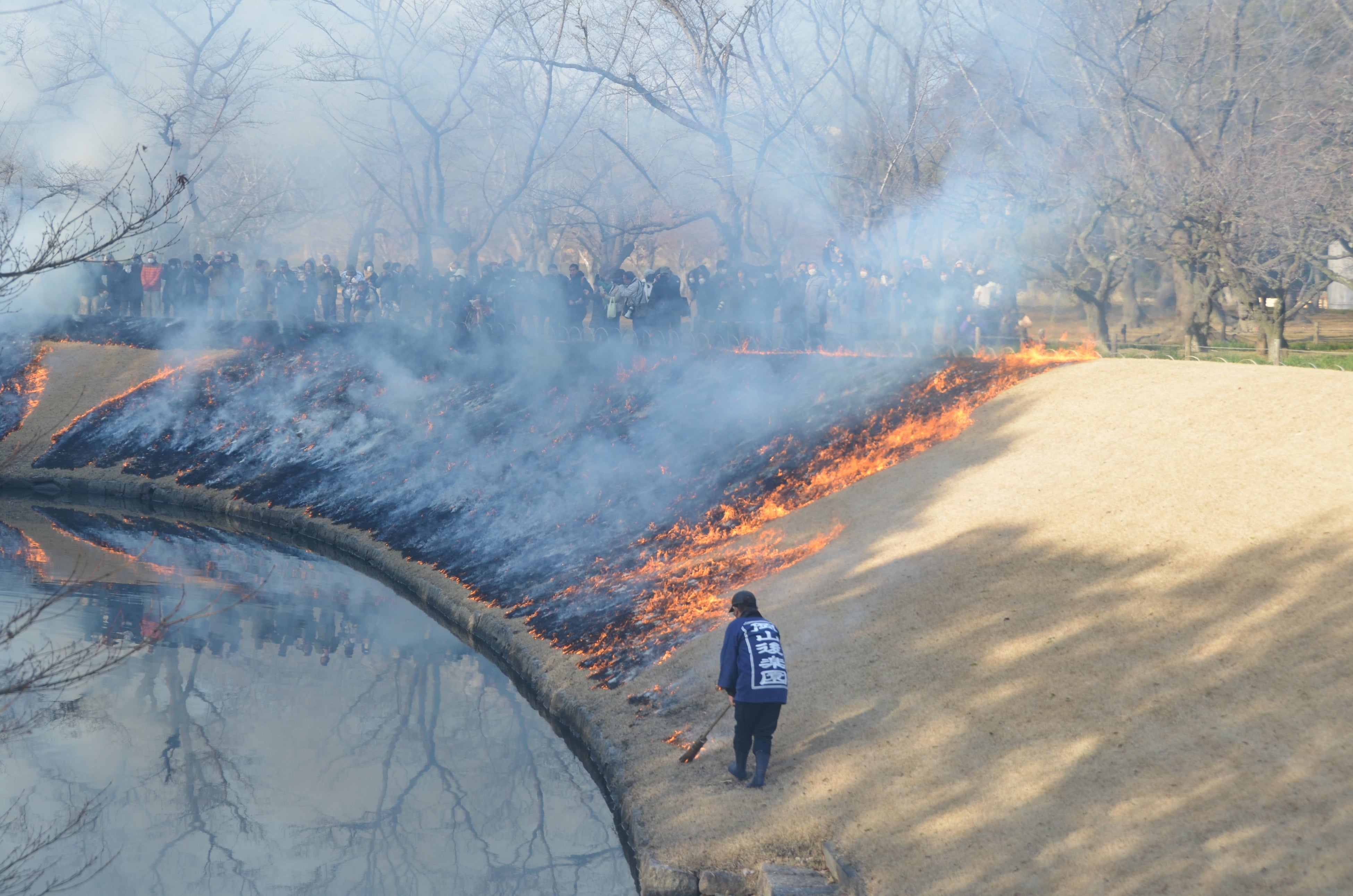 1965年よりおこなわれている「芝焼き」は、岡山後楽園に敷かれた大部分の芝を焼いていく行事です。冬枯れした芝生を焼くことで害虫を駆除し、春の新芽の出を揃え、さらに焼けてできた灰は肥料になるなどさまざまな効果があります。