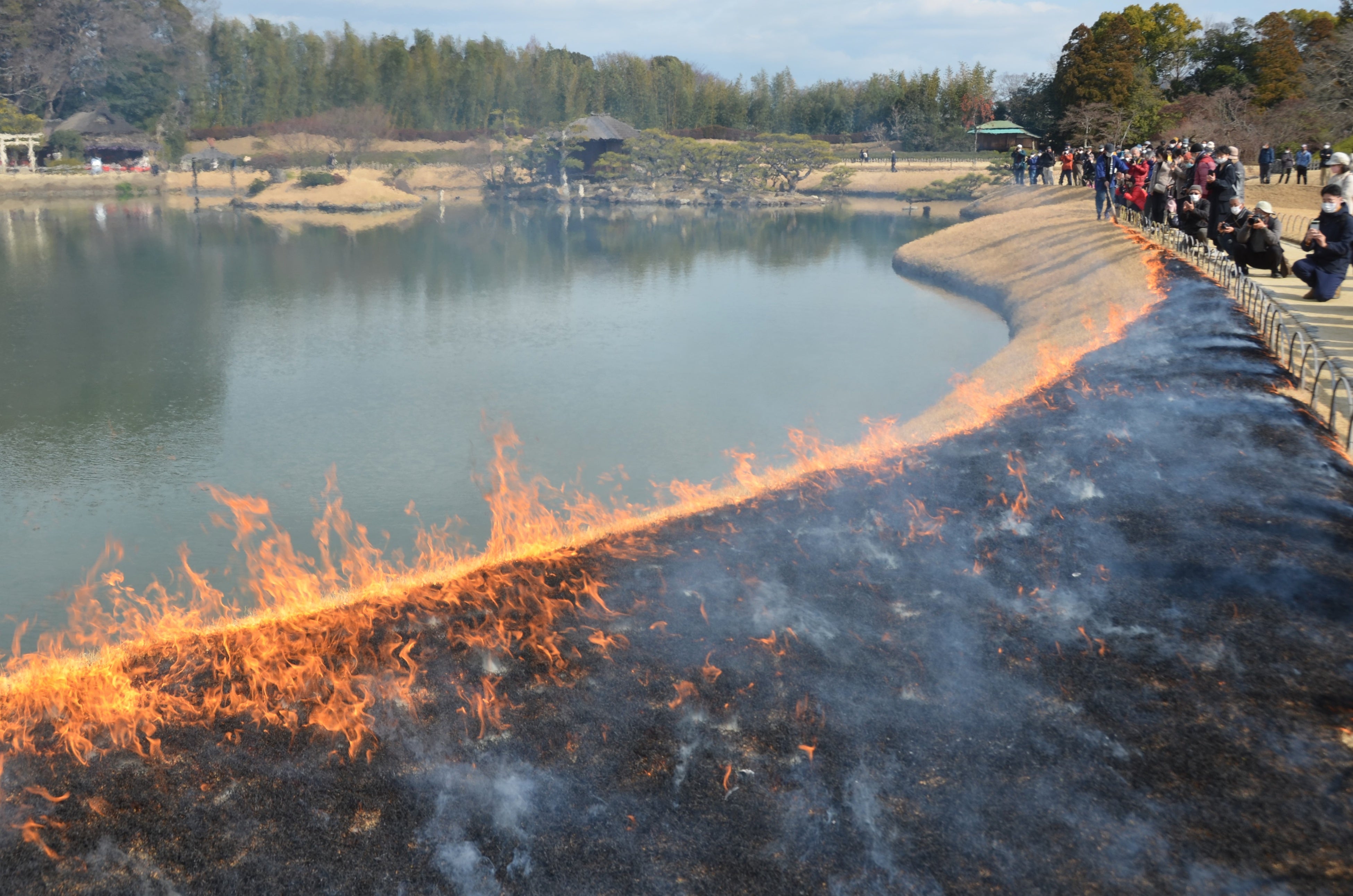 ■【岡山市・岡山後楽園】黄金色の芝が炎とともに漆黒へ変わる風物詩「芝焼き」