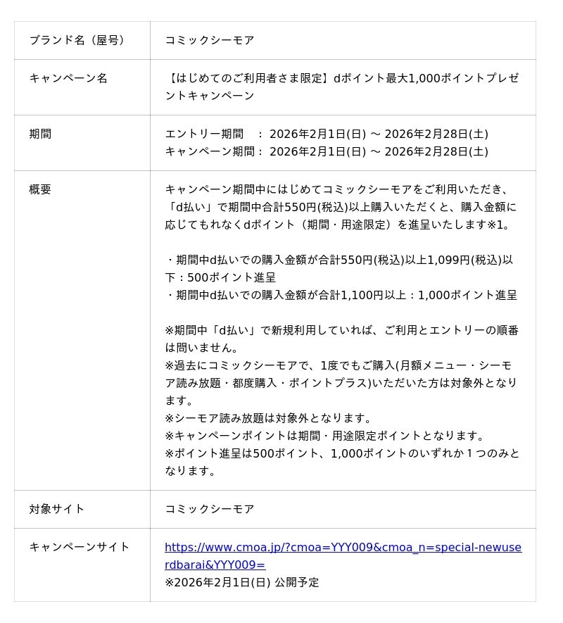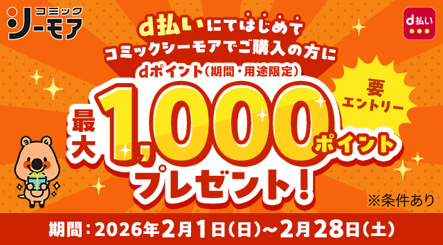 株式会社NTTドコモ(以下、ドコモ)は、コミックシーモアにおいて、「dポイント最大1,000ポイントプレゼントキャンペーン(以下、本キャンペーン)」を、2026年2月1日(日)から2026年2月28日(土)までの期間で開催いたします。