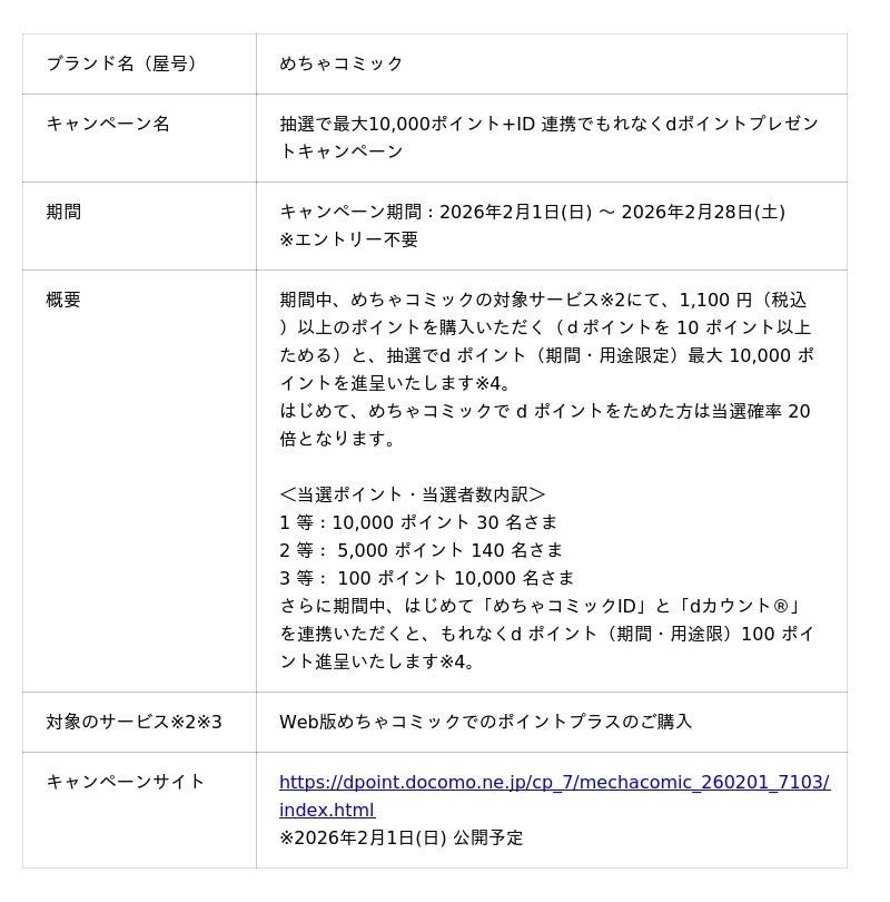 株式会社NTTドコモ(以下、ドコモ)は、めちゃコミック※1において「抽選で最大10,000 ポイント+ID 連携でもれなくdポイントプレゼントキャンペーン(以下、本キャンペーン)」を2026年2月1日(日)から2026年2月28日(土)までの期間で開催いたします。