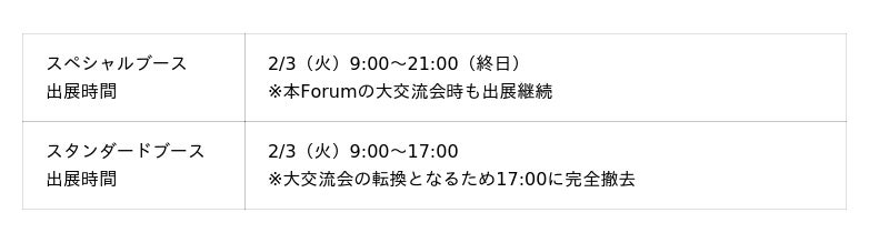 本Forumのブース出展エリアは、入口付近のスペシャルブースと会場奥付近のスタンダードブースの2か所に分かれます。