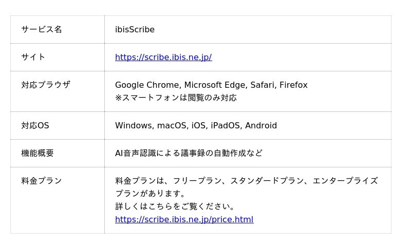 「ibisScribe」は、最新のAI音声認識技術とAI自動要約生成技術により自動で会議の記録を残すことができるAI議事録サービスです。アプリのインストールやBotの追加は不要で、Webブラウザからすぐに利用可能。1アカウント月額660円(税込)から利用でき、議事録作成にかかる業務負担を大幅に軽減します。