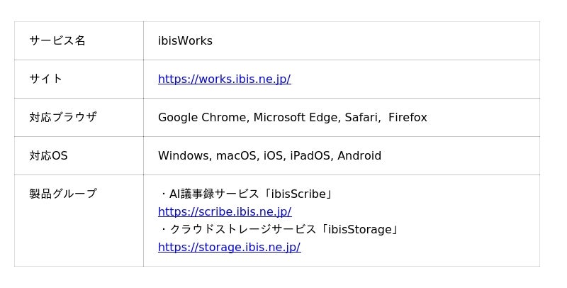 「ibisWorks」は、ゼロトラストセキュリティ対応の法人向けAIクラウドサービスです。AI議事録、AI-OCR対応電子帳簿保存、クラウドストレージなどの機能で業務効率向上をサポートします。