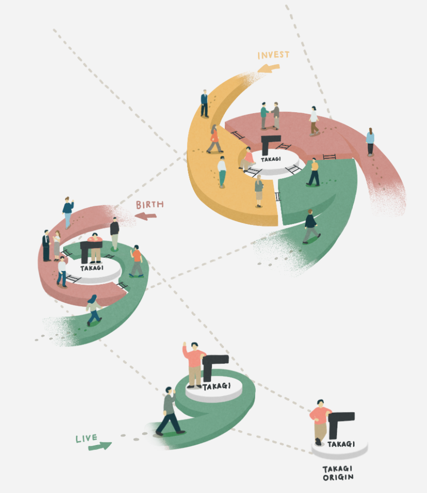 TAKAGI GROUPは、不動産という“場づくり”を起点に、人と事業が育ち、地域と地域がつながるエコシステムの構築に取り組んでいます。創業以来60年以上にわたり不動産事業を基盤に都市づくりに携わってきた一方、その基盤の上にコミュニティ運営、地方共生、グローバル連携、投資事業へと活動領域を拡張し、不動産企業の枠を超えた価値創造を推進してきました。