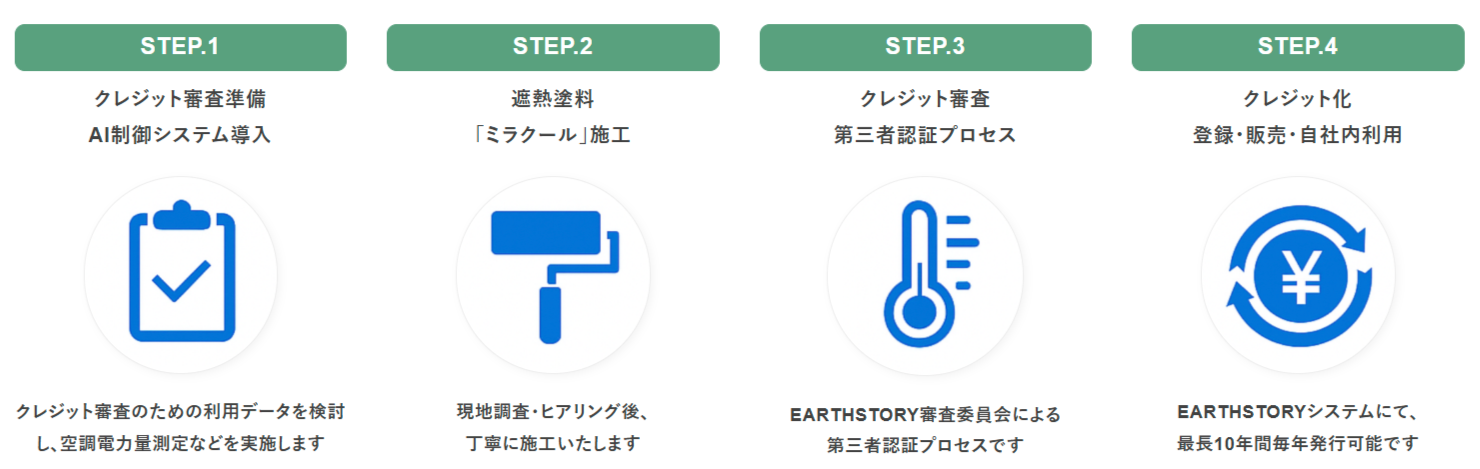 遮熱塗料「ミラクール」の施工によって得られるCO2削減効果を適切に算定・評価する方法 論を整備し、環境価値として成立させる枠組みを確立した点が、本取り組みの最大の特徴で す。このような方法論の確立は世界で初めてとなります。