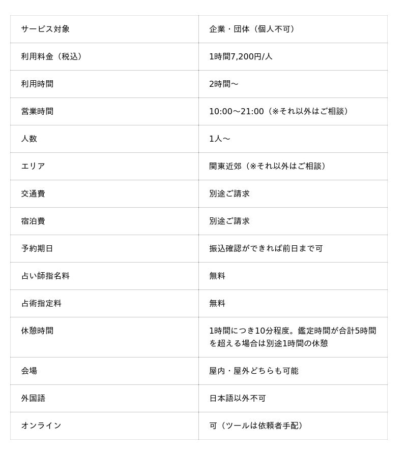 占い師派遣サービスを利用することで怪しさの払拭もできます。自社で占い師を探すのはリスクがありますが、派遣サービス(法人間取引)を通すことで「審査を通った信頼できる占い師」を呼べるという安心感があります。