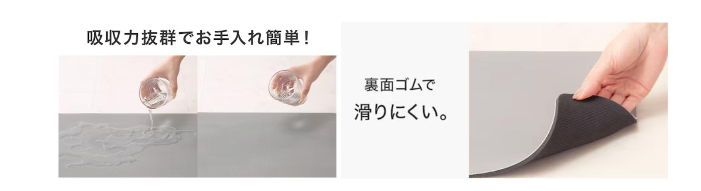 従来のソフトバスマットに使用されてきた珪藻土パウダーを今回の新商品には使用せず、やわらかく弾力性に優れたポリウレタン素材を使用することで従来のニトリのバスマットと比べて踏み心地が良くなりました。吸水力も高く、日常の使いやすさに配慮した仕様となっています。ハンガー等に吊るして干せるほか、乾燥後は丸めてコンパクトに収納できます。